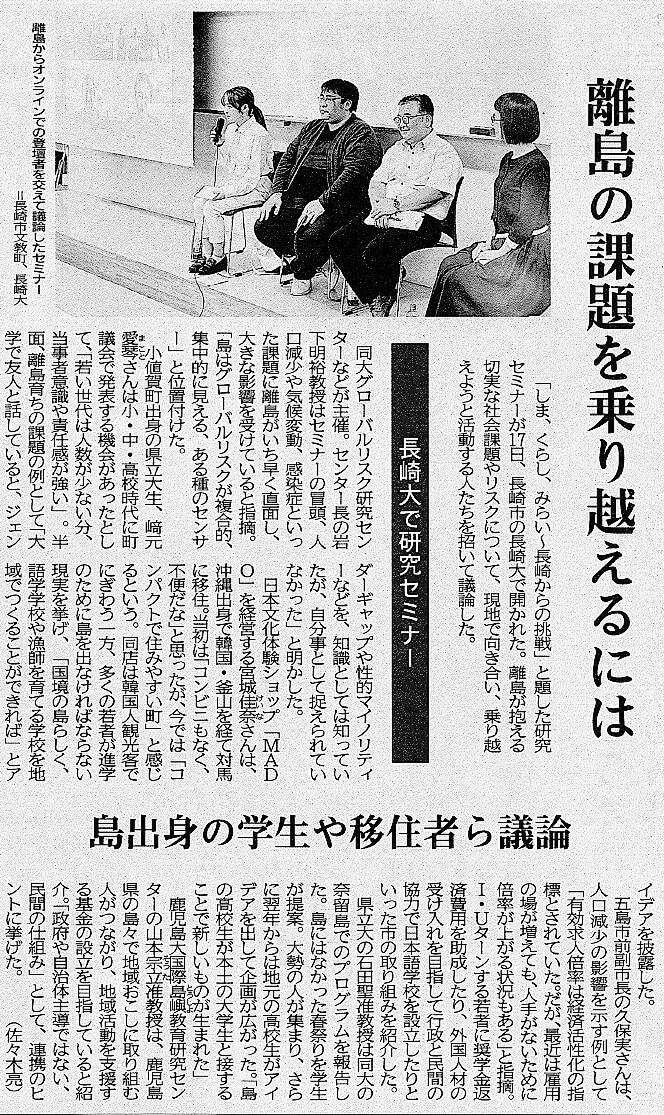 長崎大学グローバルリスク研究センターでは、島をミクロコスモスととらえ、複合リスクのセンサーとしての機能に注目しています。また長崎県は鹿児島県と並ぶ、有数の離島をかかえる自治体です。今回のセミナーでは対馬と五島列島の現地を知る方々をパネリストとして招請しました。モデレーターとして、隠岐の島などの取材経験がある田中輝美さん(元山陰中央新報記者、現島根県立大学准教授)をお招きするとともに、コメンテーターとしてオンラインで鹿児島大学国際島嶼教育研究センターの山本宗立准教授に登壇いただきました。島の抱えるチャレンジをどのように現場がむきあっているか、どうぞセミナーの模様を下記のリンクよりお楽しみください。