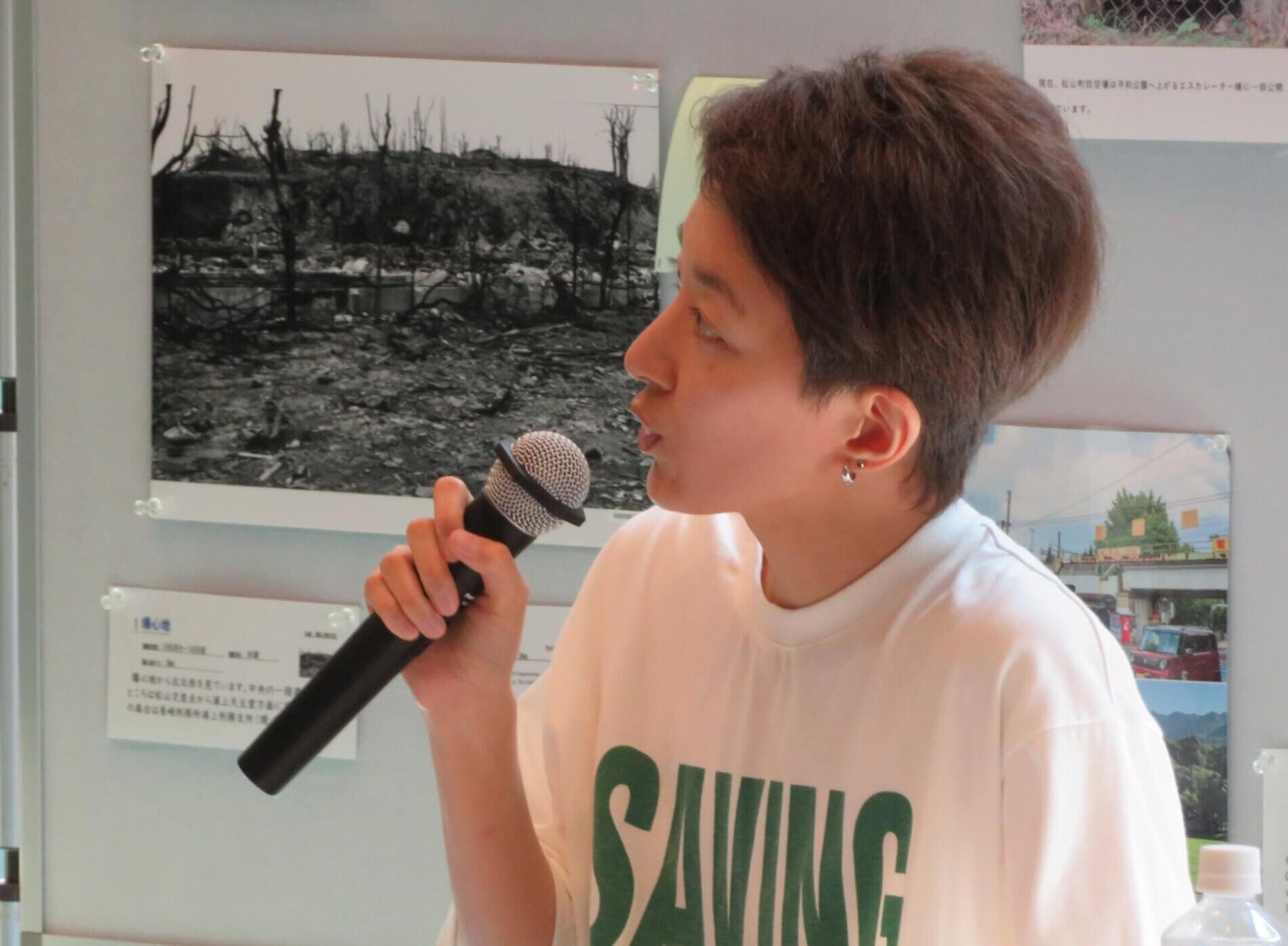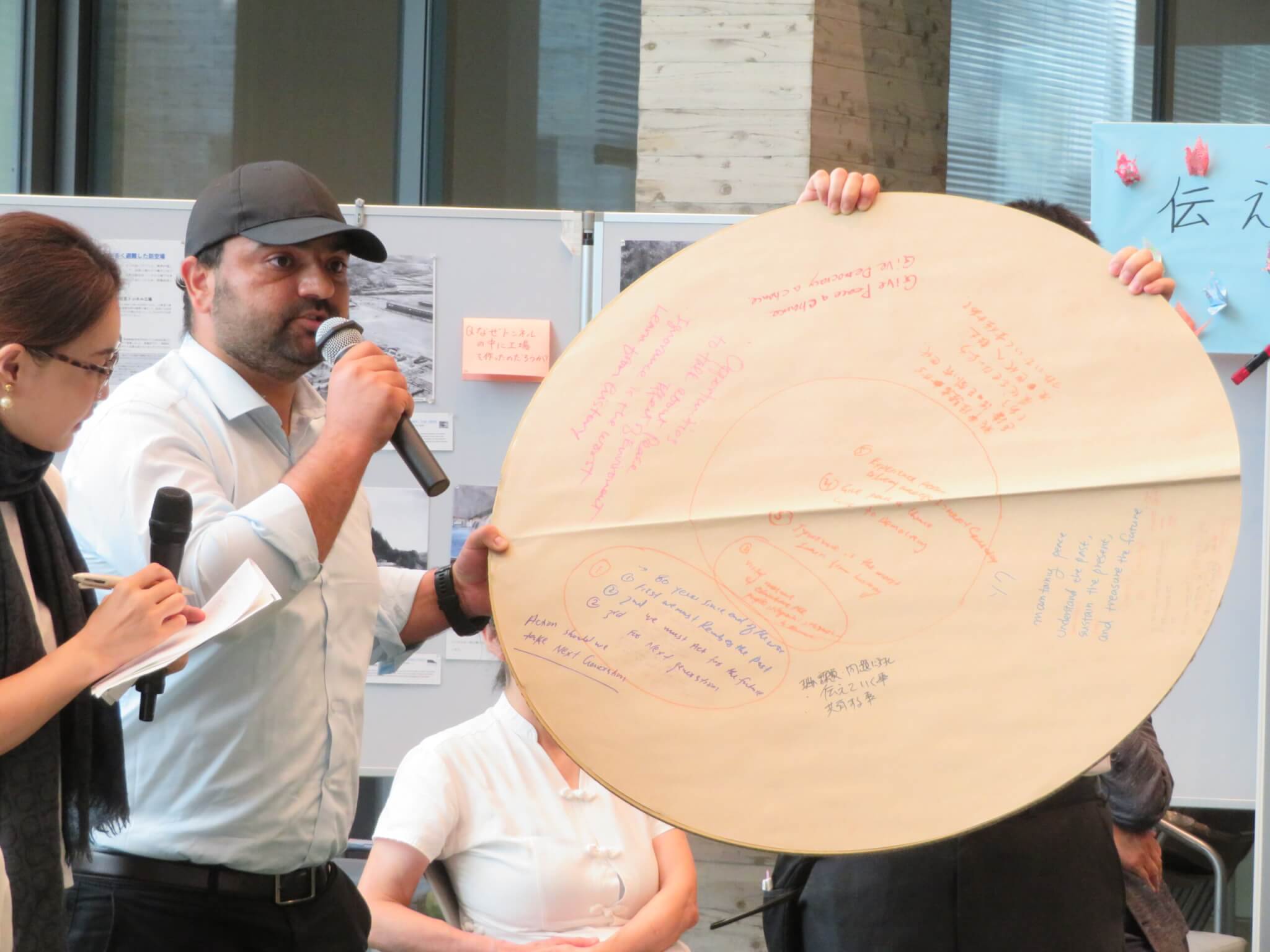 長崎被爆から80年を経て、長崎市民の核廃絶への長年の努力にもかかわらず、世界で核使用の危険は高まっています。世界の紛争後や核実験後の現状を目の当たりにした方々のお話や、沖縄・長崎からの声を聴き、様々なバックグラウンドの方と共に対話する会となりました。大学生・大学院生の参加も半数を占め、幅広い世代の一般の方々からも、自分の価値観を超えた気づきを共有できた、との感想を多く頂きました。参加者は日本人だけでなく、パキスタン・カザフスタン・韓国・キューバからの参加者も、友人や翻訳ツールによる通訳の助けを借りながら活発に意見を交わす中で、お互いの価値観を尊重することの重要性も意見に上がりました。「えんたくん」(丸形模造紙)を使ってグループでの対話をお互いに文字やイラストを描き込むことにより、アットホームな雰囲気も生まれました。