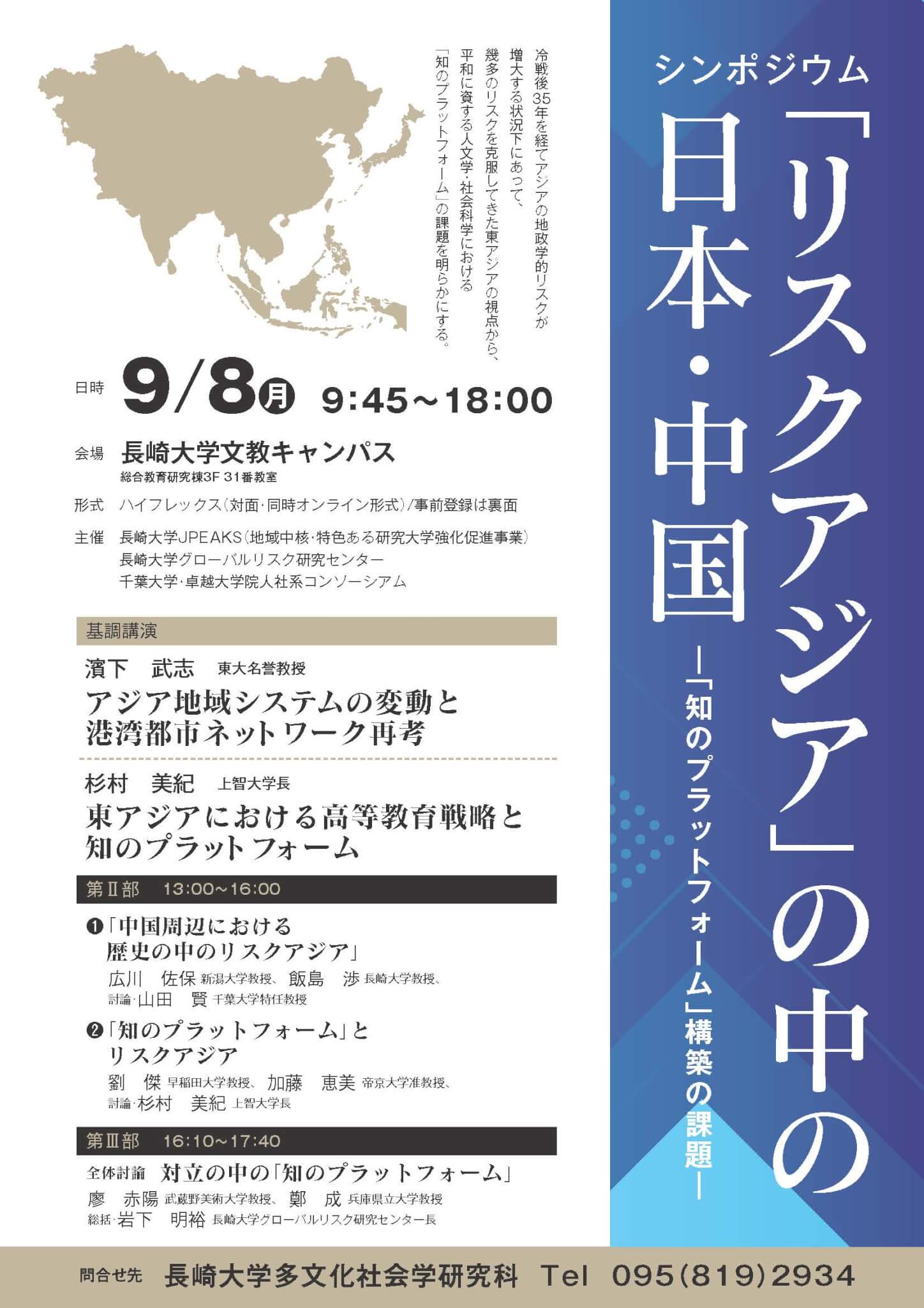 長崎大学グローバルリスク研究センター(CGR)は9月8日(月)、長崎大学JPEAKS(地域中核・特色ある研究大学強化促進事業)の一環として、長崎大学多文化社会学研究科、千葉大学卓越大学院人社系コンソーシアムとシンポジウム『「リスクアジア」の中の日本・中国-「知のプラットフォーム」構築の課題』を下記の要領で開催いたします。