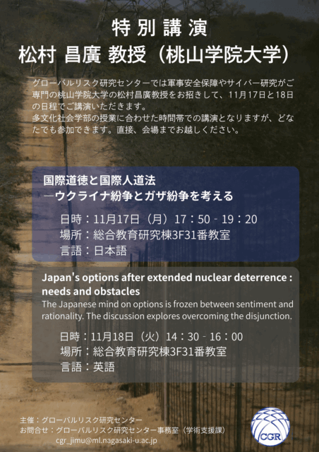 グローバルリスク研究センターでは軍事安全保障やサイバー研究がご専門の桃山学院大学の松村昌廣教授をお招きして、11月17日と18日の日程でご講演いただきます。